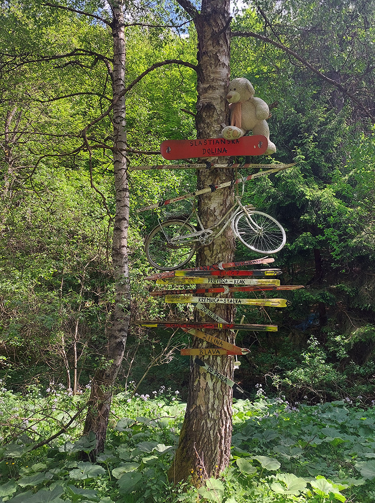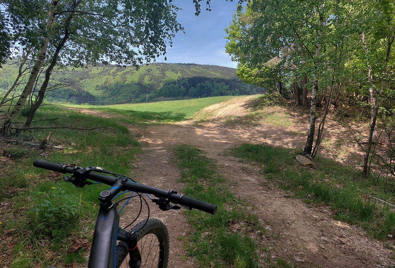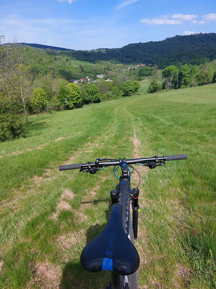 Aj tak som sa tam zamotal, pár jeleníc som vyplašil a pár ich prtí použil, kým som našiel cestu smerom na dno doliny traverzovať. No potom už to bolo jednoduché stúpanie, Kunešov neďaleko, nevysoko, cez dva mostíky, jeden z nich v rekonštrukcii. Akurát, že presne na tých lúkach ma muselo niečo pichnúť, v dedine už som musel meniť dušu. Tentokrát som plášť zvnútra poriadne prehmatal, či v ňom niečo neostalo zapichnuté ako minule. Dva razy meniť sa mi nechcelo. Zato začala štrajkovať moja historická pohotovostná pumpa, tak ďalšie zdržanie – doprosovanie, kto by požičal nejakú funkčnú. Vďaka patrí miestnym poľovníkom na chate za dedinou.
