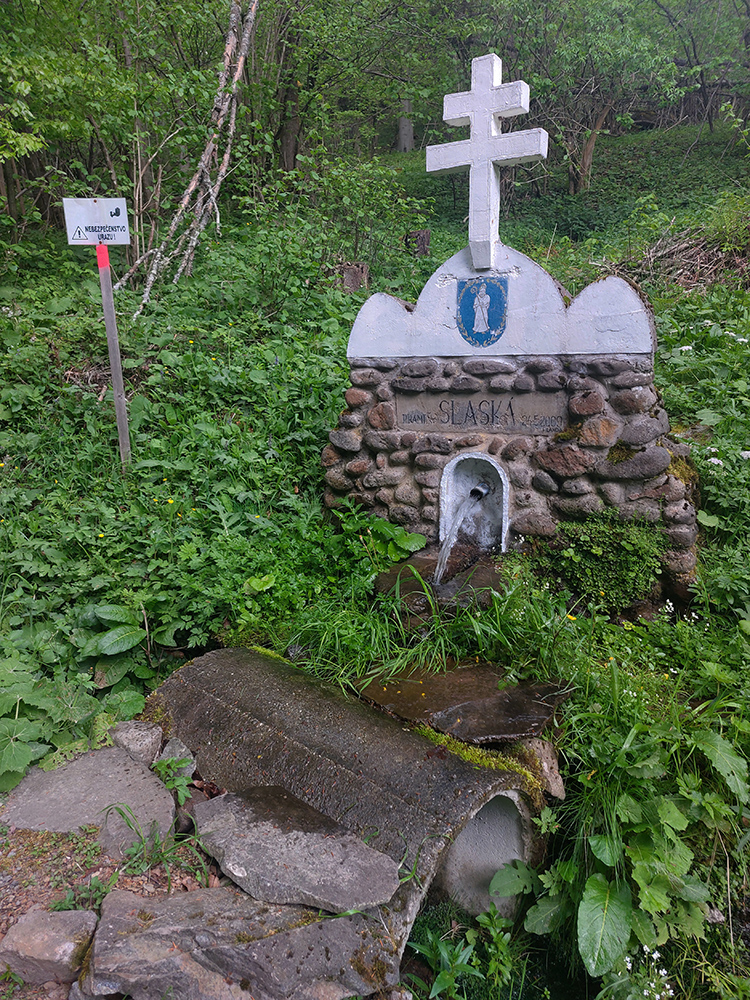 A to bol už posledný výšľap, pohodlný, rovný a dlhý. Najskôr po asfalte, potom po šotoline. Aj popri troch „filandovských“ upravených prameňoch, akurát sa mi hodili na dotankovanie. V doline sa podľa pohľadov na ťažkú techniku a kopy dreva dosť ťaží, no cesta v pohode.