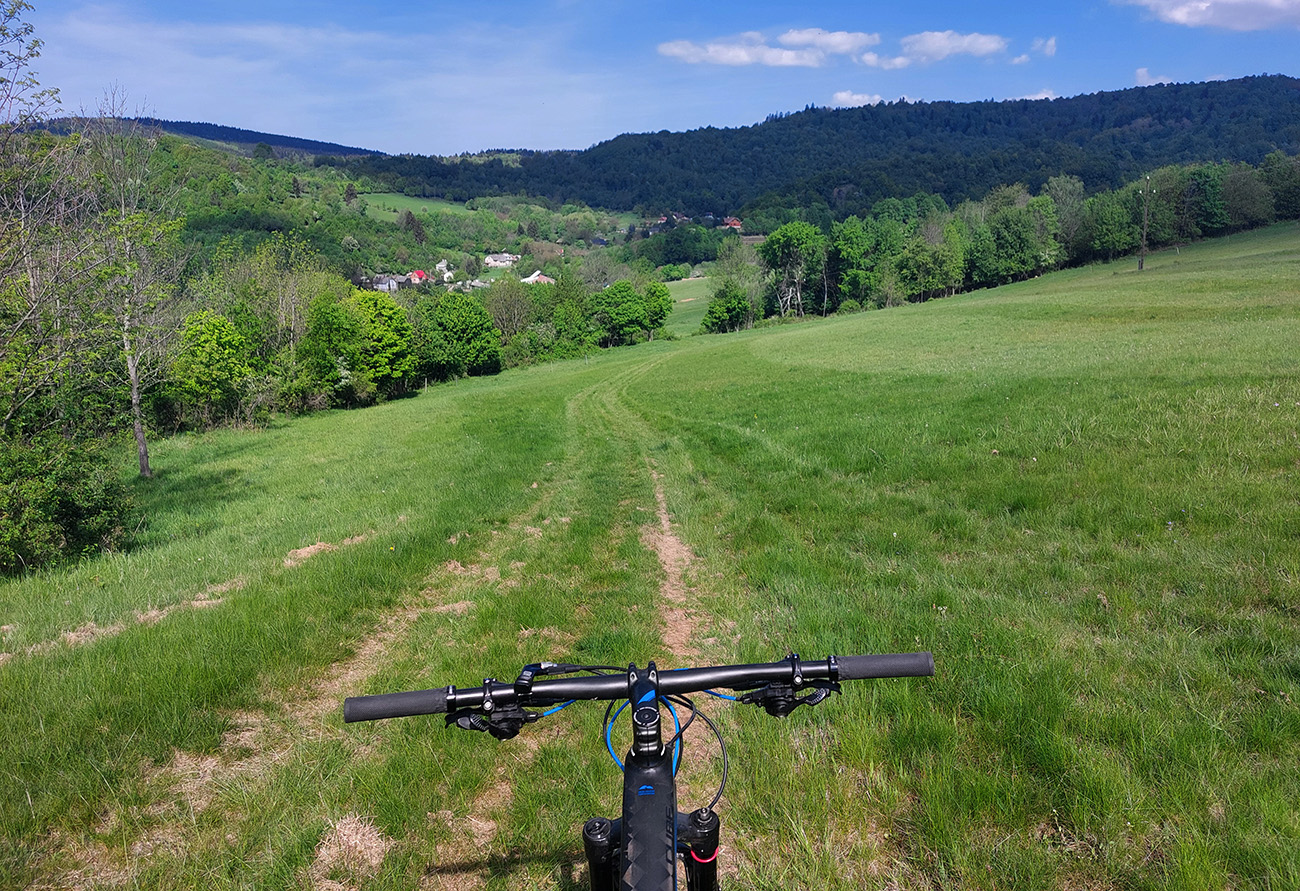 Do Slašťanskej doliny vedie z Bernardova poriadne dlhý a poriadne strmý zjazd – no, opačne by som to na bajku nechcel ísť. Ale v mojom smere komfort: hlina v lesoch, hladká tráva na lúkach, zväčša. Na spodku som sa aj pripojil ku trase, ktorou som tadeto išiel naposledy, z Kopernice po tých dvoch defektoch. Rozdiel bol ale v dojazde na dno doliny, kde ma to znovu vypľulo pri schátraných maštaliach – tentokrát som zamieril doprava, hore dolinou.
