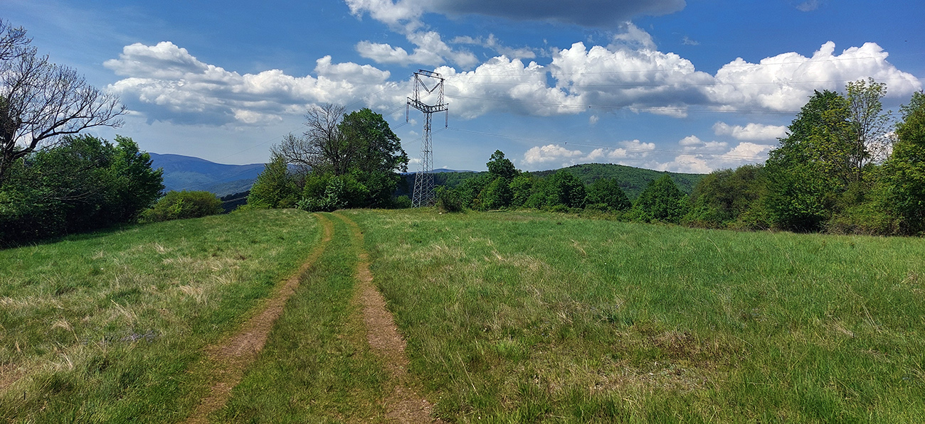 Už som vedel, že to budem musieť skrátiť, ale nevadilo. Užil som si krásny spodný (južný) okraj Kunešovskej planiny, príjemne po trávičke pomedzi remízky lesa. Následne aj prejazd cez lúčnatý Bernardov (884 m) s parádnymi výhľadmi. Na lúkach sú tu všade mohutné múry z vyzbieraných kameňov – voľakedy to tu miestni kosili.