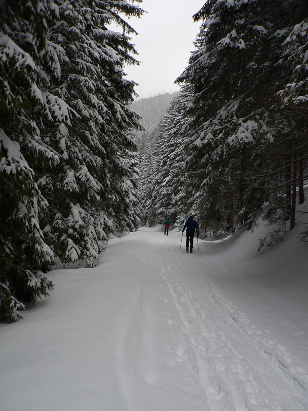 Nad chatou stopa nikde - a k sneženiu silnejúci vietor, ktorý sa v tom amfiteátri točil ako osa na cukríku (najviac od západu). Do Žiarskeho sedla čím vyššie tým horšie – vďaka hmle a pár desiatkam centimetrov čerstvého snehu. Našťastie vyššie nad kosovkou sa to menej prepadávalo – sneh je tam ubitý a niekde aj vyfúkaný na ľadové platne. Ale tých je máličko. Teplota síce pod nulou, ale riadne vlhko. Takže pod sedlom ani prašan nebol, ale taký hnusný, vetrom ubitý, cestou dolu lyže ťahal, každú na inú stranu, samozrejme :-)