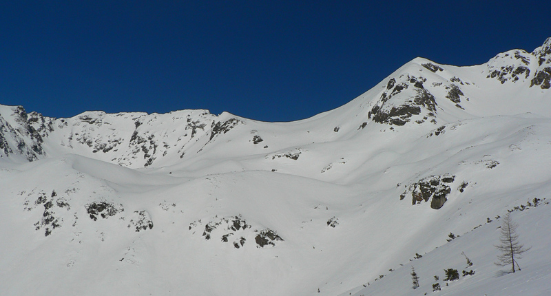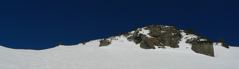 Skoro až do sedla sa dá ísť priamo, bez traverzovania, až tak parádne to drží. Haršajzne už ale samozrejme treba, ľadová kôrka sa strieda s naviatymi ufúkanými doskami, hrubými pár centimetrov. Hore pohodička, opaľovačka, len slabý vietor zo severu, ale niekoľko metrov pod horizontom je už dokonalé závetrie.