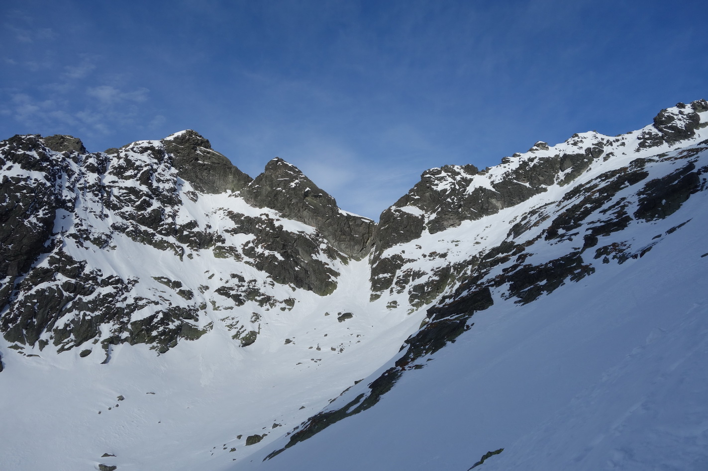 Vyrážame s menším oneskorením z Tatranskej Lomnice, zvládneme šoférske komplikácie pri ceste na Popradské pleso, auto vrátime poslušne naspäť k električke a po deviatej teda štartujeme. Odtopenú asfaltku ideme na peši s lyžami na batohoch. Debatou nám cesta ku káve a makovej štrúdli chytro ubehne a po posilnení sa vydávame Mengusovskou dolinou, vidíme stopy zimnou cestou na Rysy, odbáčame teda tade a dostávame sa nad hranicu lesa. Pásmom kosodreviny to ide príma, terénne nástrahy boli citlivo odstránené a šanca chytiť koreň pri zjazde rapídne klesla. Slnko je len také zubaté a nevie sa akosi medzi mrakmi prebiť. Naberáme postupne výškové metre, občas to na tvrdom podklade podšmykne, ale žiadny horor.