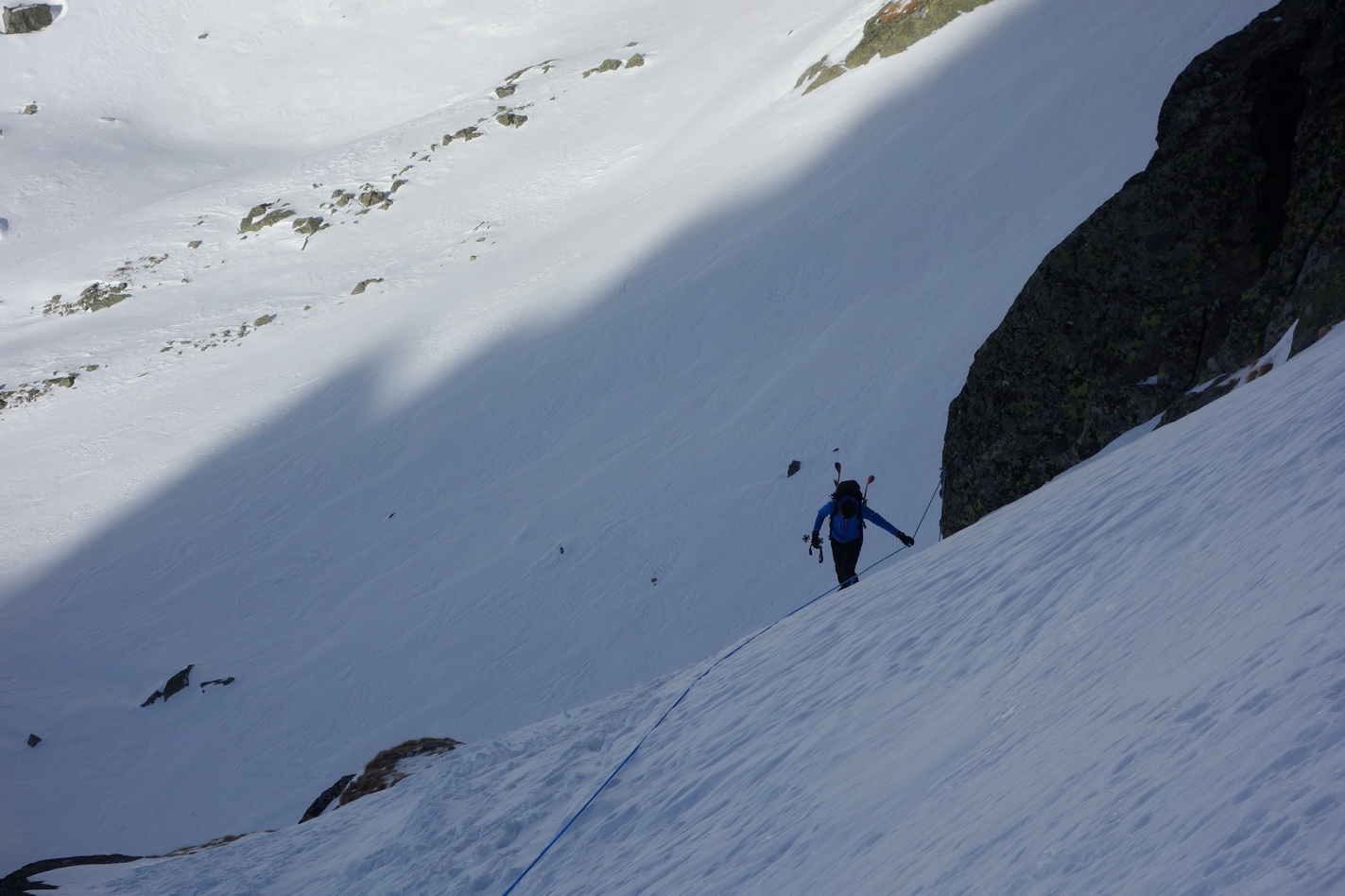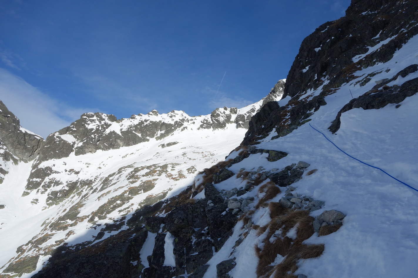 V rampe nad Žabími plesami stopa, že ani mačky netreba. Samozrejmosťou natiahnutý fix, takže úplna vianočná pohoda. Aj slnko sa spamätalo a snaží sa tvrdý podklad na želaný firn premeniť. Ideme teda ešte do Váhy, hádam sa to s tým firnom podarí. Pofotíme známe pohľady od Gerlachu až po Belianky. Nemožno si nevšimnúť tvoriaci sa ľad v Galérii Ganku a známy pohľad na tatranský sever je zase čímsi nový.