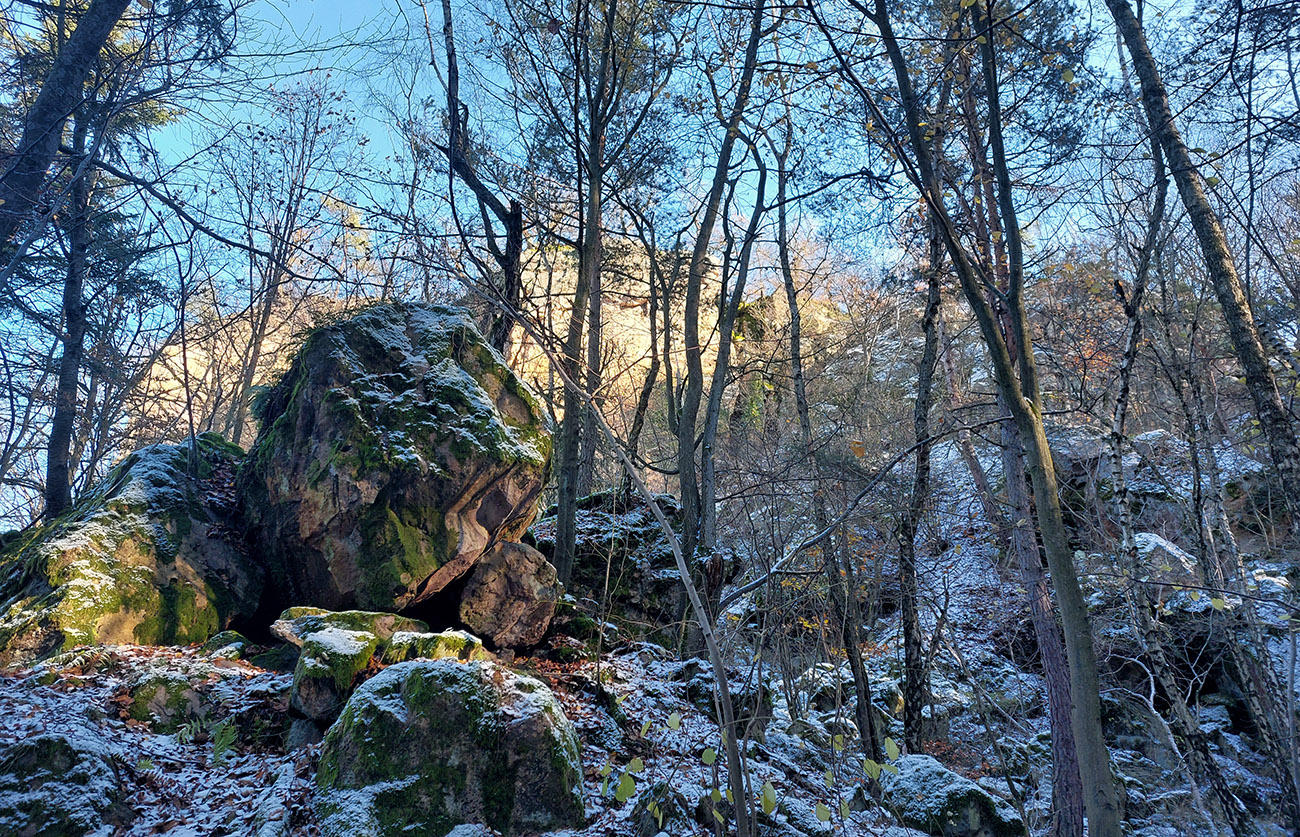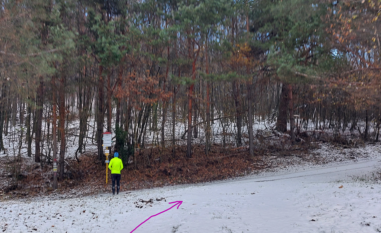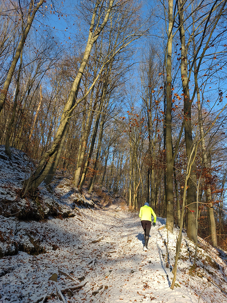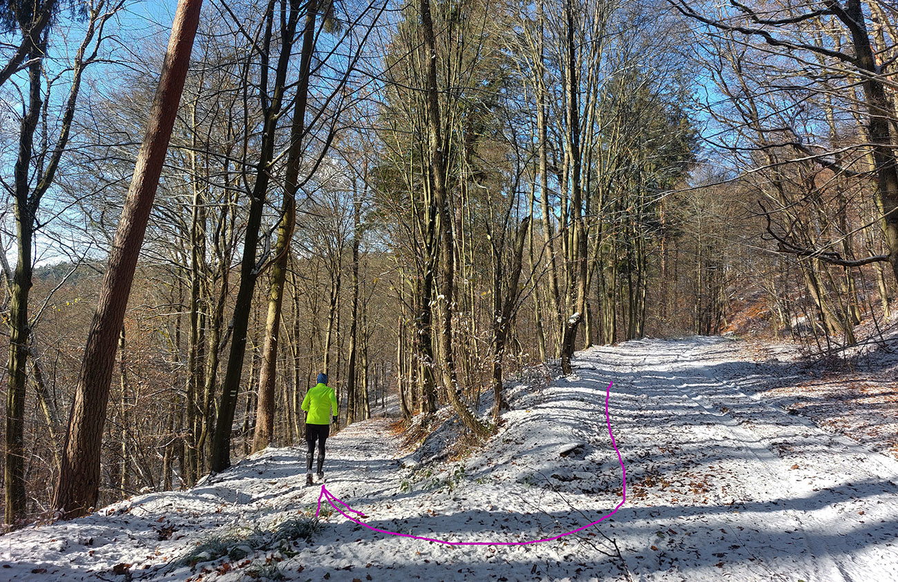 Prevažne pekná cesta rozhraním lesov a lúk potom pokračuje od toho pseudohradu na sever po žltej značke. Tu sme chvíľu kopírovali trasu Štiavnického ultra punku, ale na križovatke Priehon sme odbočili opačným smerom - doprava dole, smer Repište. Aby sme hneď po pár metroch uhli doľava, do lesa. Veď nebudeme predsa pobehovať po dedine, po asfalte, že? Lesná cesta po východnom (a čoraz strmšom) úbočí kopca Bralce nad Repišťom (aj toto je iné Bralce ako to predtým) po chvíli skončila a čakal nás druhý úsek bez cesty, poriadne hrboľatý. Z toho bralca na vrchole kopca sa dole lesom poriadne šutre gúľajú. Zapadané lístím a už aj snehom, v strmom svahu to bola jedna rozkoš pre nohy. Ale krátka, po chvíli už sme boli na zelenej značke a zase na trase Ultra punku.