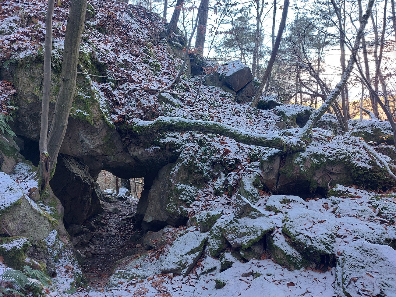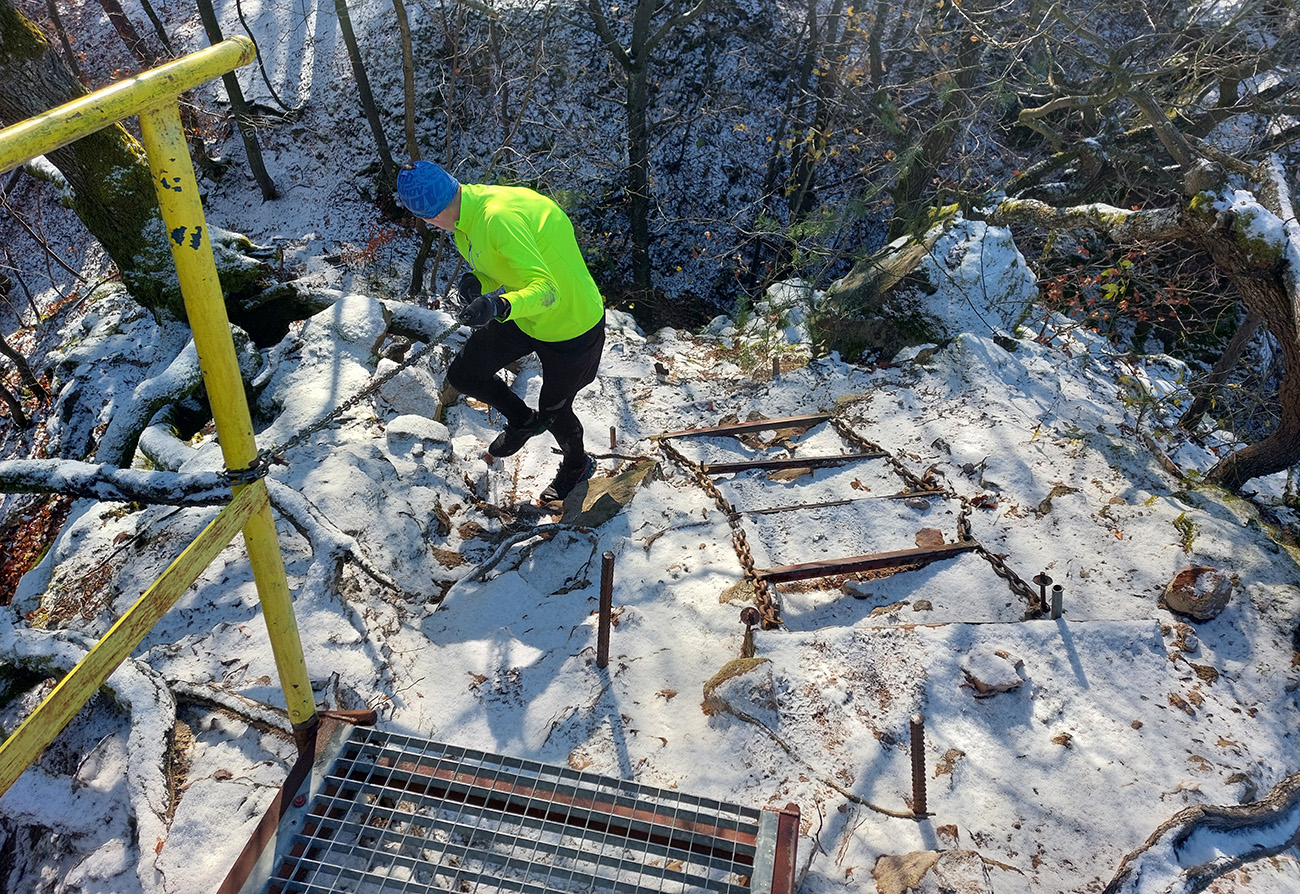 Rýchlo sme potom zbehli dole do Lehôtky a rýchlo sme ju aj opustili, lebo tam štipľavo prefukovalo. Ale fajne sme sa zahriali už onedlho, štrikovaním pomedzi skalky, skaly, balvany, skalné steny, previsy - no proste interiérom PR Bralce. Dokonca jedno skalné okno a nejaké rebríky – neskutočná krajina, kde rozpadávajúci sa ryolitový masív dotvorili ľudia ťažbou kameňa. Stačí pozrieť na mapu, ako tade zelená značka kľučkuje. Parádne miesta, pár výhľadov. Zasekali sme sa tam hodnú chvíľu, lebo obzerať bolo čo a pobehovať sa tade ozaj nedá.