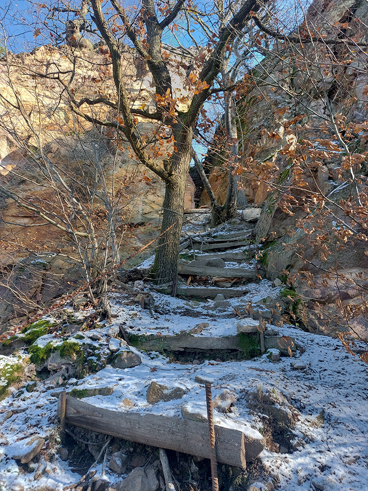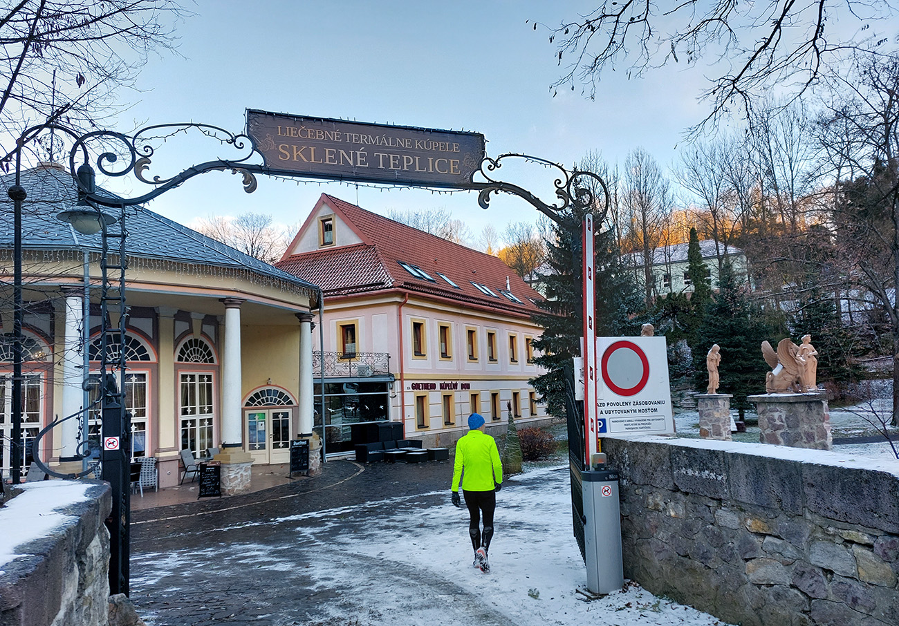 Nasledoval prevažne zbeh do Sklených Teplíc, čím bližšie do doliny, tým strmší. Spestrili sme si ho krátkou zachádzkou na Pustý hrad (alebo hrad Teplica). Fakt je tam pusto, len nejaké zvyšky hradnej pivnice a obmedzený výhľad pomedzi holé konáre. Potom už teda strmo dole, Teplice už v tieni, slnko ešte maľovalo kostolnú vežu a okolité vrcholky. Prebehli sme areálom kúpeľov, popri pariacich sa travertínoch a davaj het.
