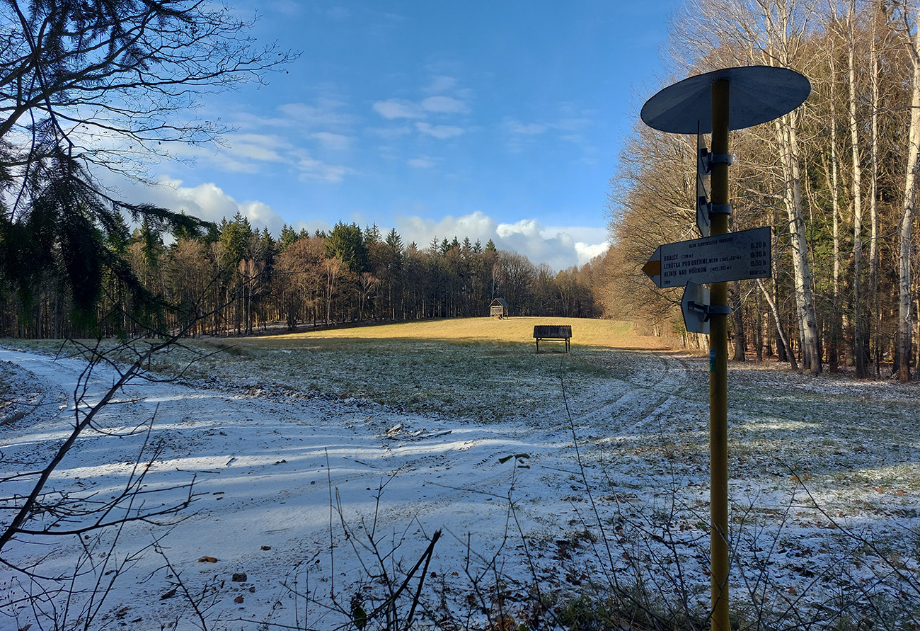 Popri miestnom cintoríne sme nabehli do posledného dlhšieho/strmšieho stúpania, po žltej do osady Konice. Dobré cesty, horšie cesty, jedna osamotená chalúpka a pri nej dobre padla voda zo studničky, aj takto v zime bolo už treba dotankovať. O kúsok vyššie, z lúky, sme si vychutnali farebnú tieňohru nízkeho slnka za mrakmi nad západným horizontom, a potom už to ďalej také strmé nie je. Dokonca aj mierny zbeh v ústrety Konickému vrchu a ceste, ktorá do osady Konice vedie zdola, z kotliny. Na začiatku sme po nej chvíľu išli, oboma smermi, pri zachádzke do Opatoviec.