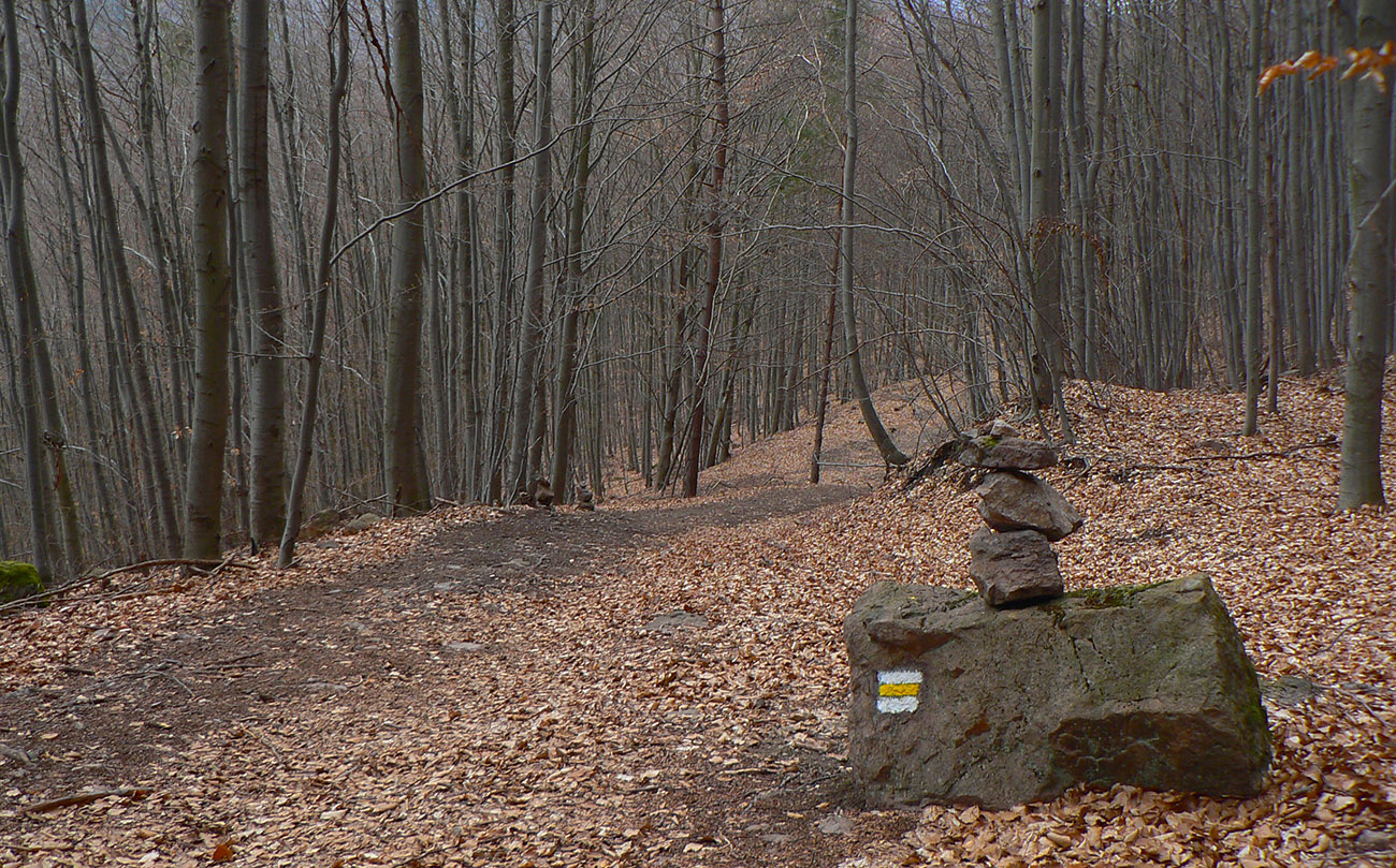 Bude to pohodová prechádzka - a dá sa aj pohodovo zokruhovať. Ako sa totiž červená začne z križovatky lesných ciest (hneď za rampou) prudšie dvíhať, stačí odbočiť doprava - a po príjemnej lesnej ceste ponad železnicu to netrvá viac ako 15 minút k žltej značke, ktorá na kopec stúpa z opačnej strany. Veď na mape vidno. Červená je na výstup ale príjemnejšia, menej prudká aj menej hrboľatá. Vychádza (priamo oproti tej žltej) do sedielka s vysielačom. Sklon výstupu sa dá ešte zjemniť použitím obchádzkovej cesty. Aj na bajku by sa dalo, len pod sedlom je to prudšie. Cestou je aj malý kameňolom, alebo skôr pieskovňa – celé to ryolitové bralo (kedysi dávno lávový prúd) totiž leží na staršom, ale nespevnenom sopečnom materiáli.