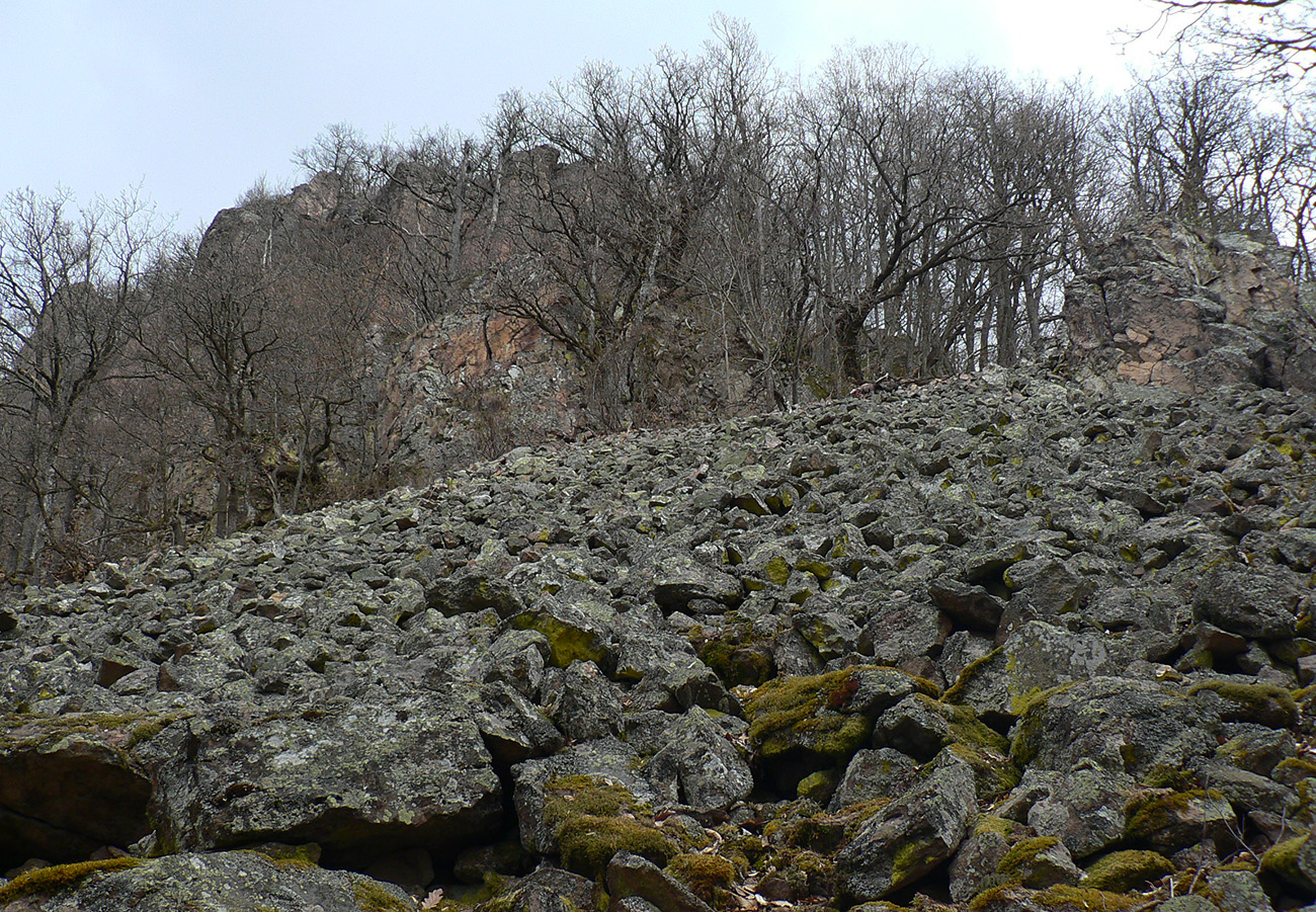 Tak - vyobzeraný, idem dole. Žltá značka je pod sedlom najskôr dosť hrboľatá, ako križuje skalné blokovisko a kľučkuje pomedzi balvany, napadané zhora zo stien. Potom sa ale stočí do protismeru a podklad sa vyrovná, sklon sa zmierni. O chvíľku sa chodník stretne s lesnou cestou. Kto by si chcel vychádzku ešte nadstaviť, práve tam by sa mal otočiť doľava, čiže na chvíľu opustiť značku. Cesta síce po chvíli končí, ale ďalej pokračuje skalnými mužíkmi značený chodník. Vedie popri hraniciach chráneného územia k najkrajšiemu skalnému moru pod najvyššou stenou brala na južnom svahu. Cestou k nemu sú aj dva zaujímavé múry, postavené v roku 1929 na zachytávanie zhora sa valiacich balvanov – aby sa nekotúľali až na koľaje. Trať totiž obtáča Jastrabskú skalu pekne z troch strán.